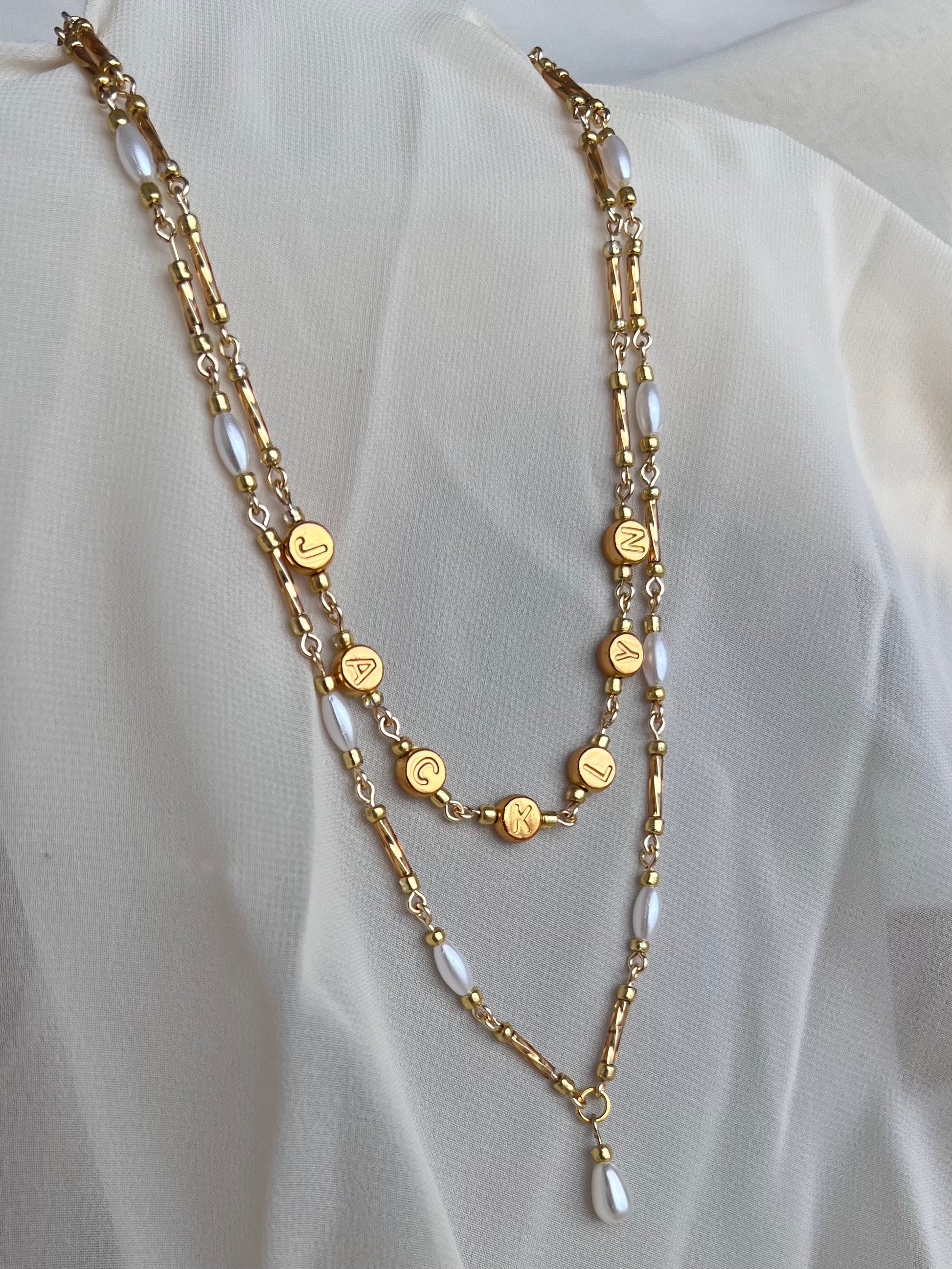 gold color pearl drop necklace with with wire and beads (only a single necklace, other necklace pictured not included)